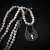 The shorter necklace is a classic strand of white pearls knotted on a silk thread with a small ornate padlock.